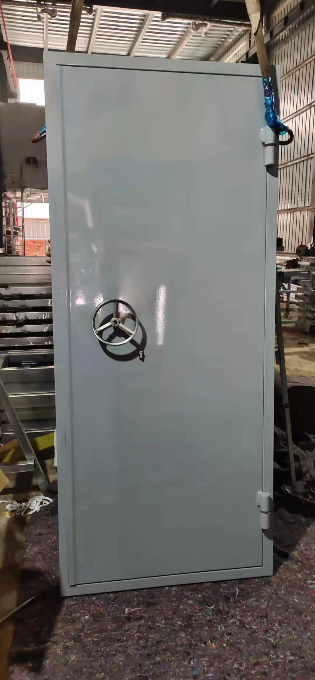 门框采用50mm*120mm*5.0mm槽钢;合页采用压力轴承合页;锁采用防爆手轮锁或逃生推杠锁(常开扇需配备闭门器)。