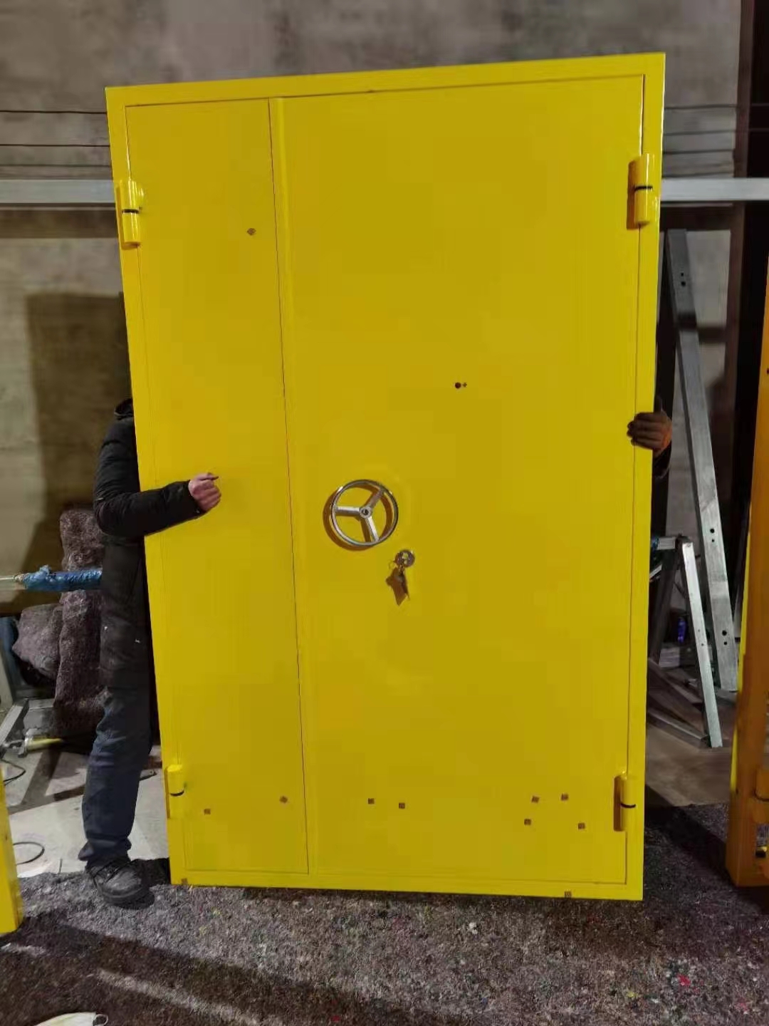 门框采用50mm*120mm*5.0mm槽钢;合页采用压力轴承合页;锁采用防爆手轮锁或逃生推杠锁(常开扇需配备闭门器)。
