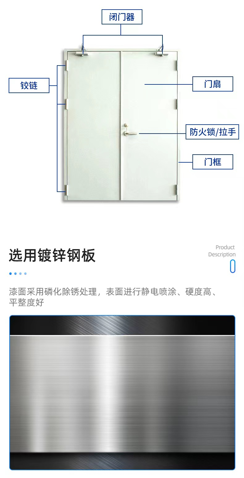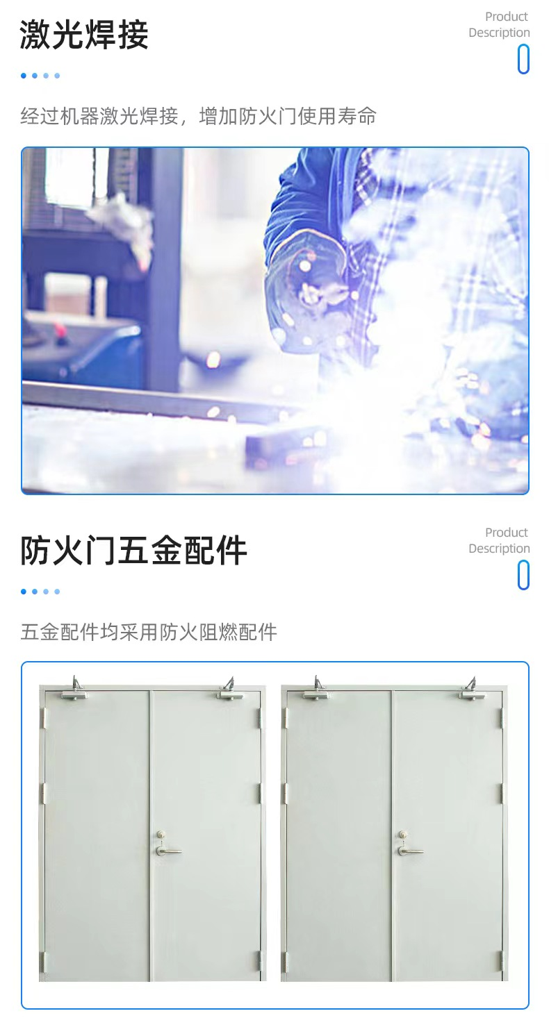 耐用性强:钢制防火门通常采用耐腐蚀、抗氧化的钢材制造,不易生锈、变形、开裂,使用寿命长。